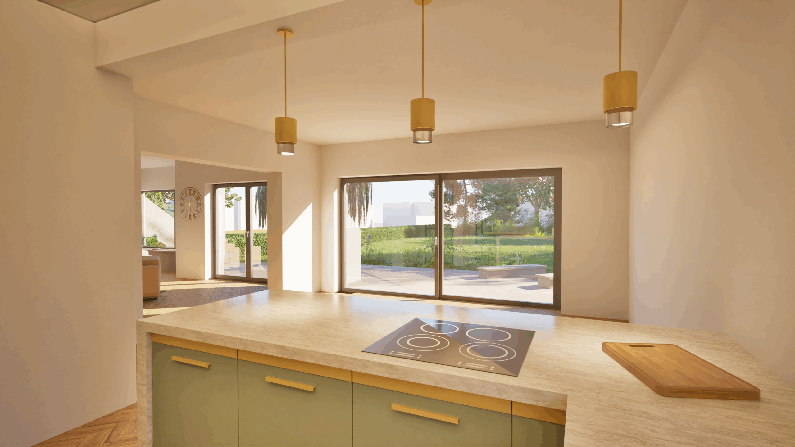 In unserem aktuellen Projekt begleiten wir die Planung einer Sanierung eines Einfamilienhauses. Die Bilder zeigen die 3D Visualisierungen unserer Planung.
